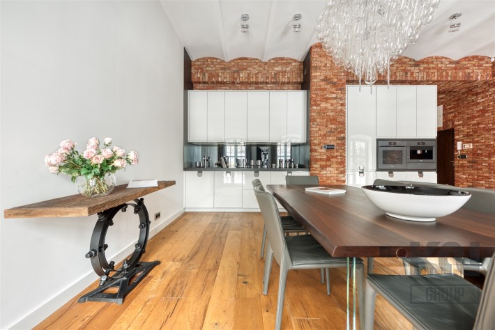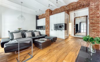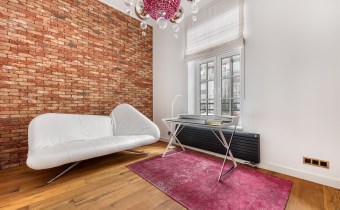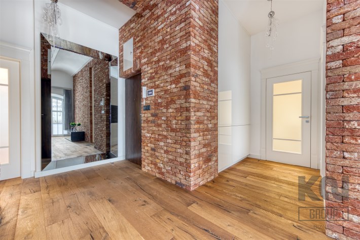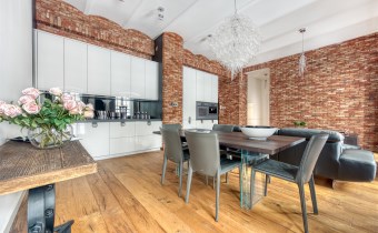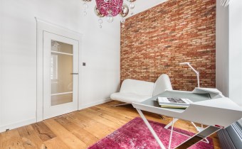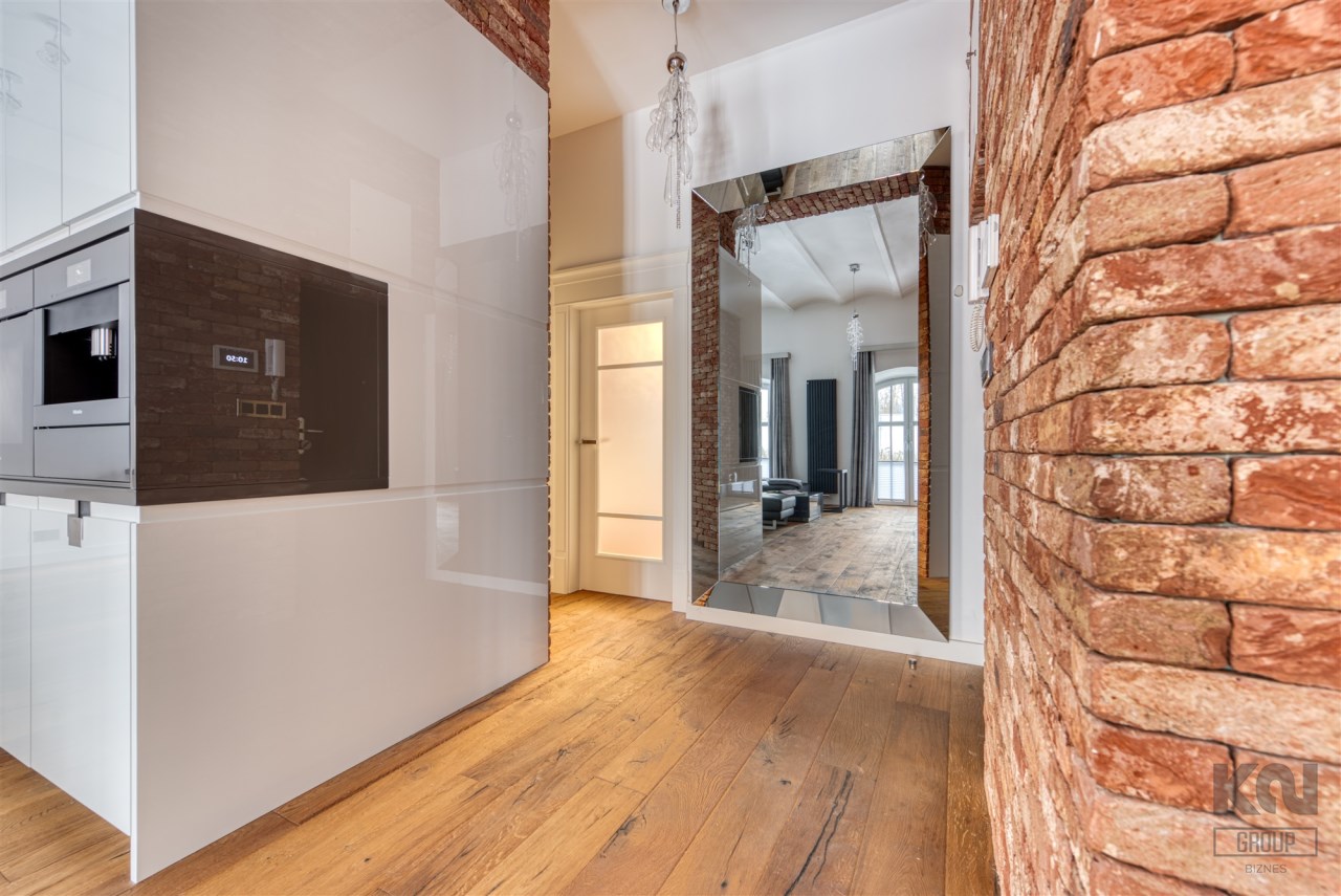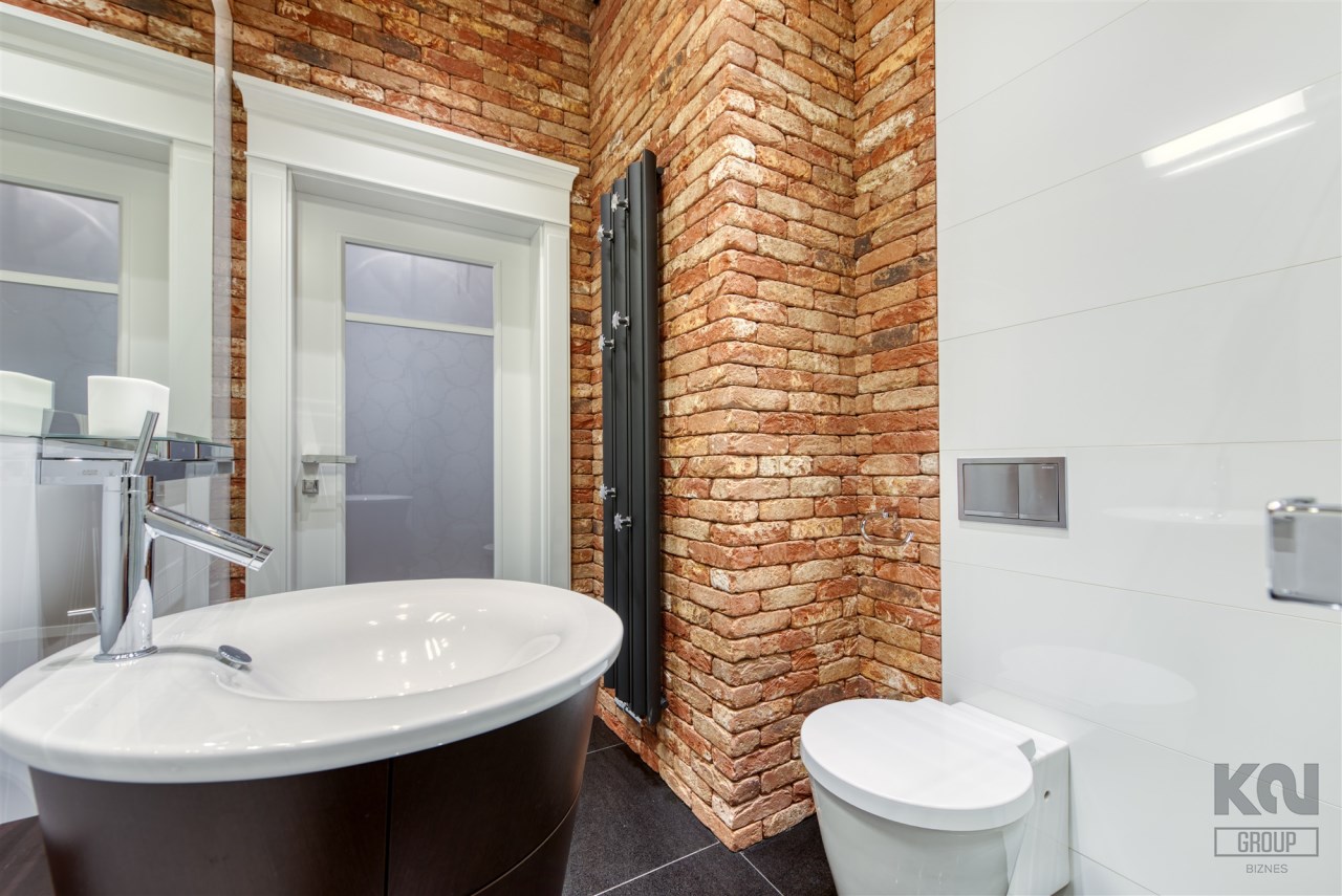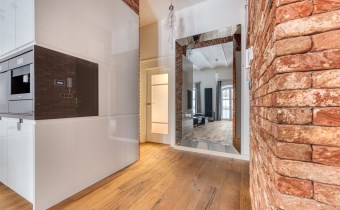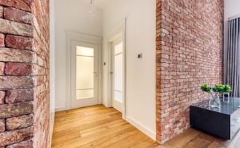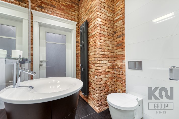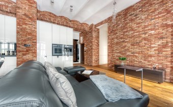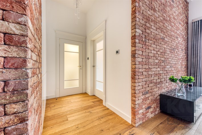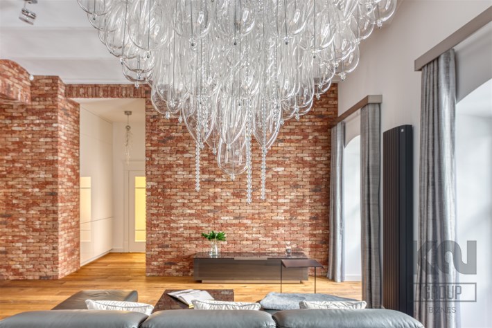 - cały apartament wykończony jest cegłówką sprowadzoną z Włoch, podkreślającą loftowo-industrialny charakter wnętrza;