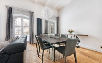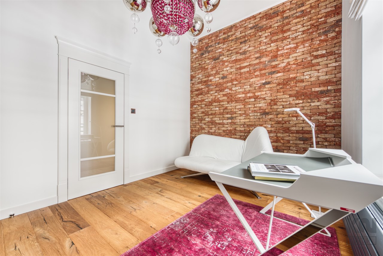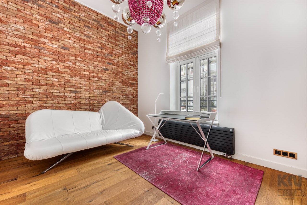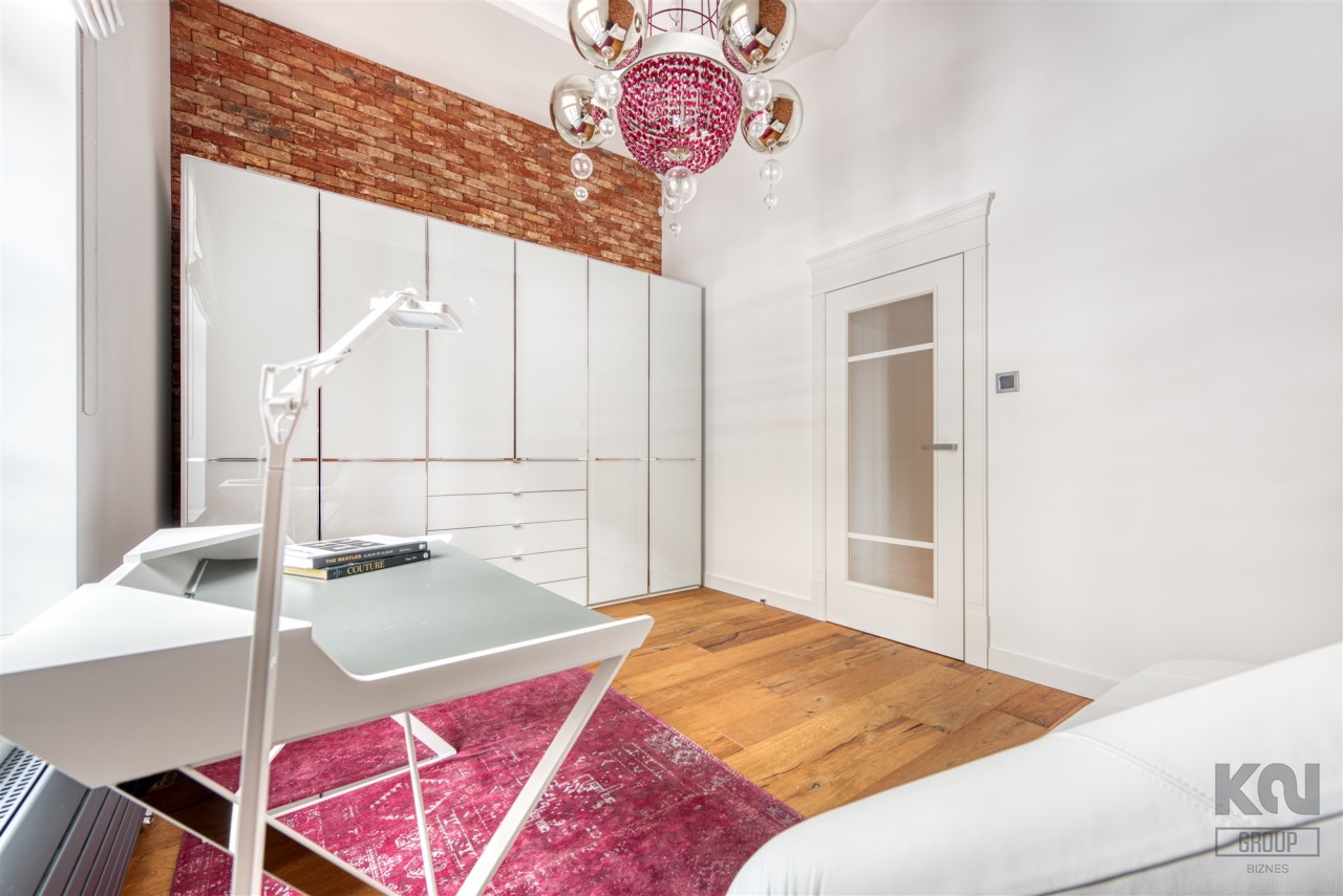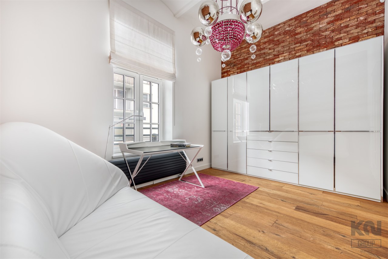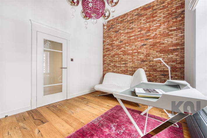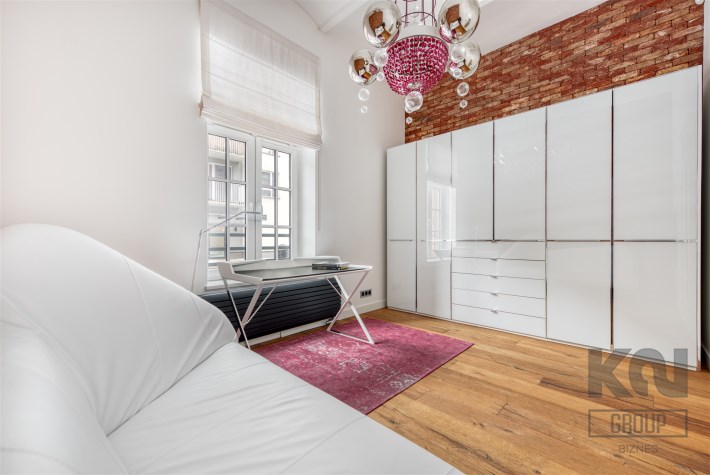 - gabinet (lub dodatkowa sypialnia) wyposażony w designerską sofę, biurko i zabudowane szafy;