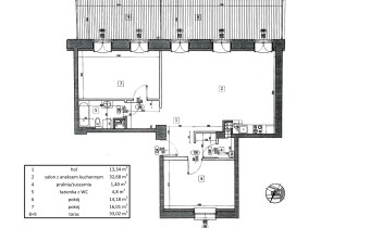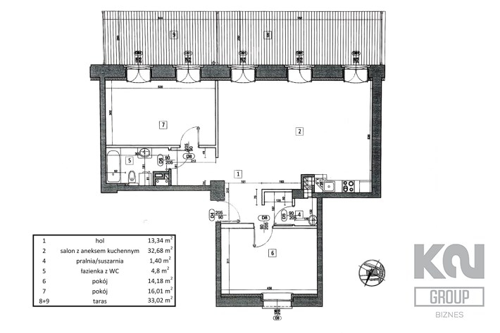 - reprezentacyjny salon z aneksem kuchennym i wyjściem na taras o powierzchni 33 m2;